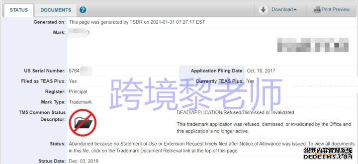 有些卖家们跟黎老师反映,这个标之前被驳回了,后来代理一直没办法解决,问我们能否解决。经黎老师一查,结果如下: