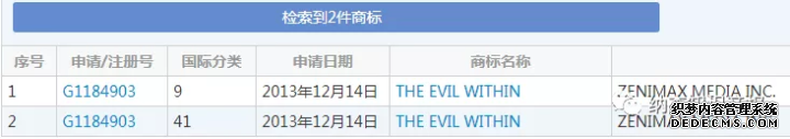 通过商标检索可看到,ZeniMax Media 在中国申请注册了2件“THE EVIL WITHIN”商标,分别是第9和41的国际分类。