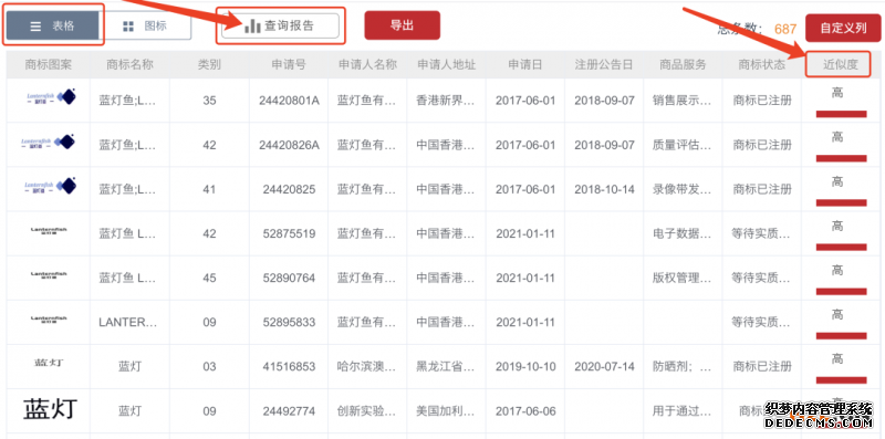 查询结果会按照与您所查商标的近似度高低进行排序呈现,这样您就可以清楚的看到是否与他人在先申请/注册的商标构成类似商品/服务上的相同/近似商标啦!