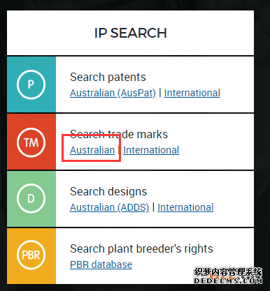 紧跟着我就将目光关注到IP搜索的菜单栏,找倒第三项也就是关于商标的查询。而澳大利亚的知识产权局非常的贴心,不单单有澳大利亚本国商标的查询方式还有关于国际商标的查询方式。申请人因为要查询的是澳大利亚商标,所以在查询商标那一选项中选择澳大利亚(Australian )这一选项。